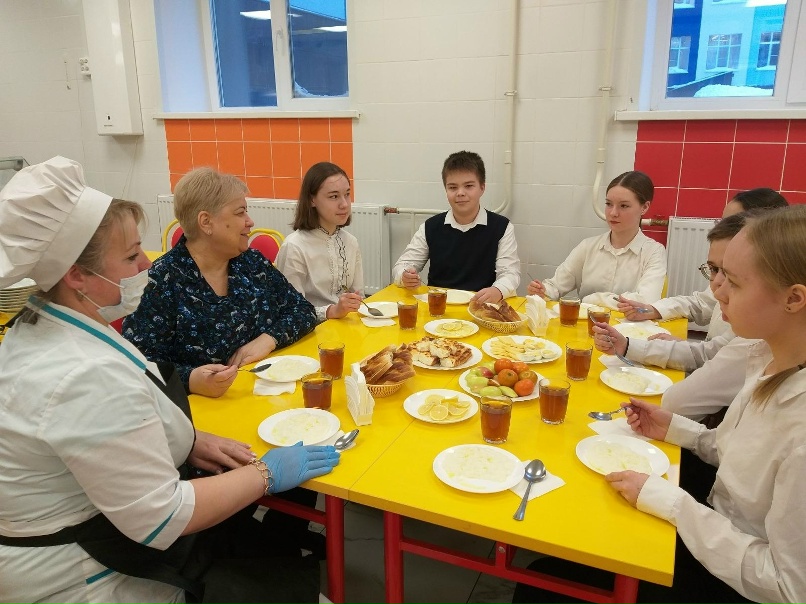 Директор поинтересовалась у ребят, нравится ли им качество завтраков и обедов, которые готовят в школьной столовой, рассказала о полезных свойствах каши для детского организма. Завстоловой Немцева Т. А. ознакомила с правилами сервировки стола. Еда должна быть не только полезной, но и красивой. Ребята с удовольствием позавтракали.